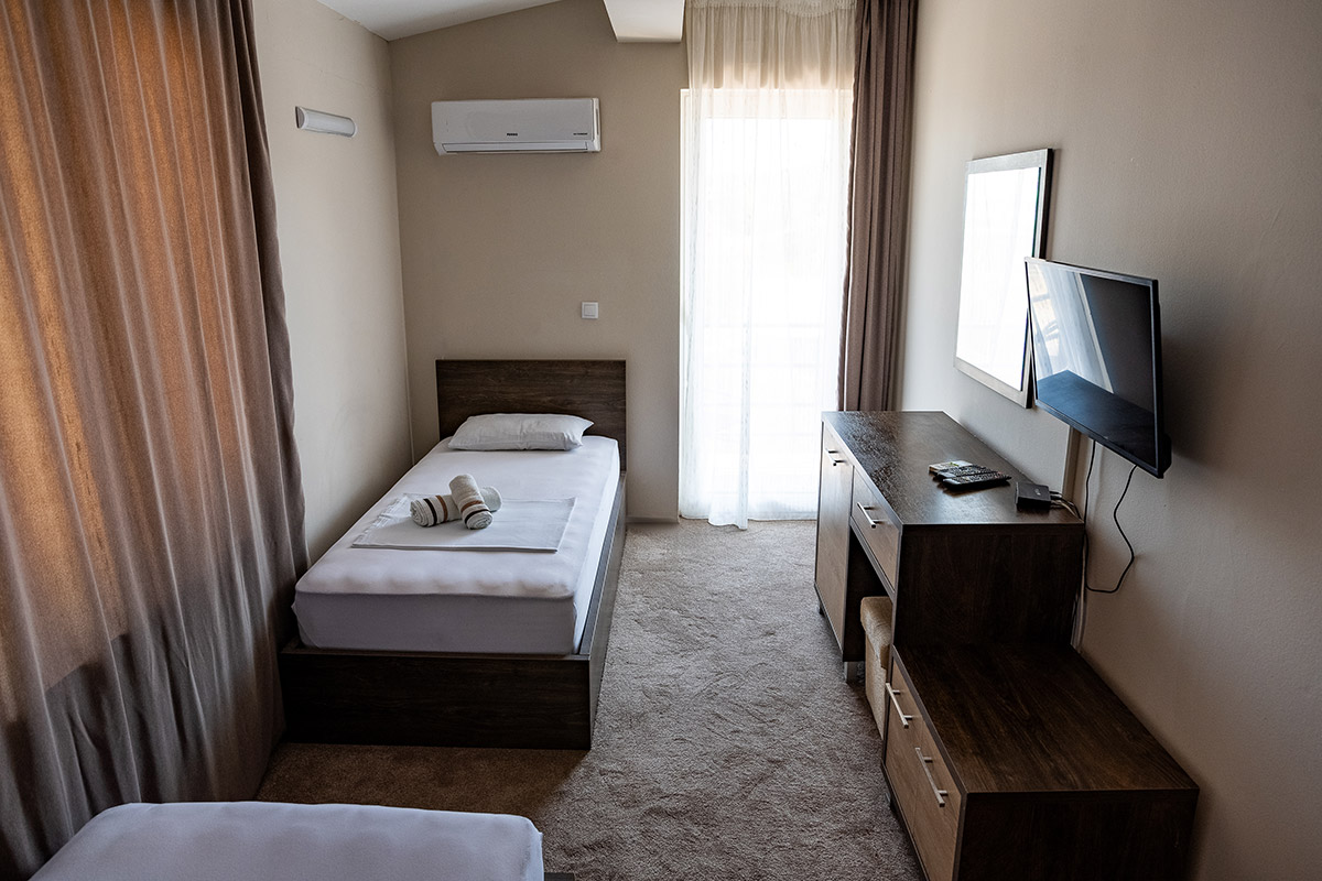 The room features two comfortable beds, high-quality bedding, and ample space for a pleasant stay. A large window allows plenty of natural light throughout the day and offers a lovely view of the greenery, enhancing the sense of peace and privacy.