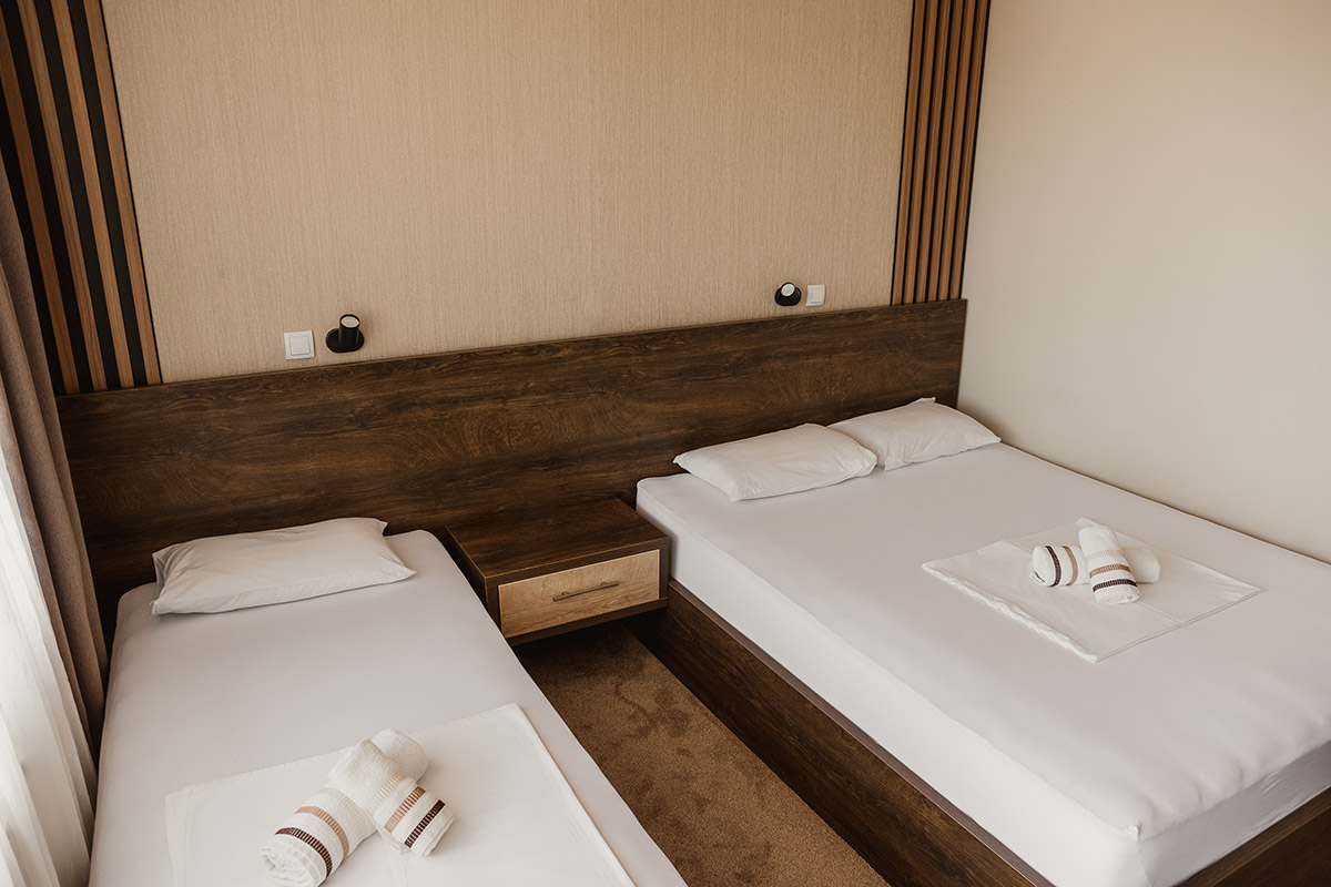 Собата располага со два удобни кревети, квалитетна постелнина и доволно простор за пријатен престој. Големиот прозорец овозможува природна светлина во текот на целиот ден и нуди убав поглед кон зеленилото, што дополнително придонесува за чувството на мир и приватност.